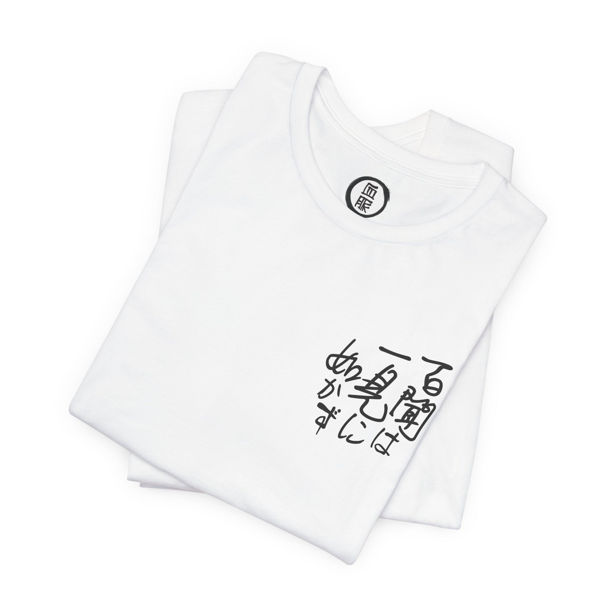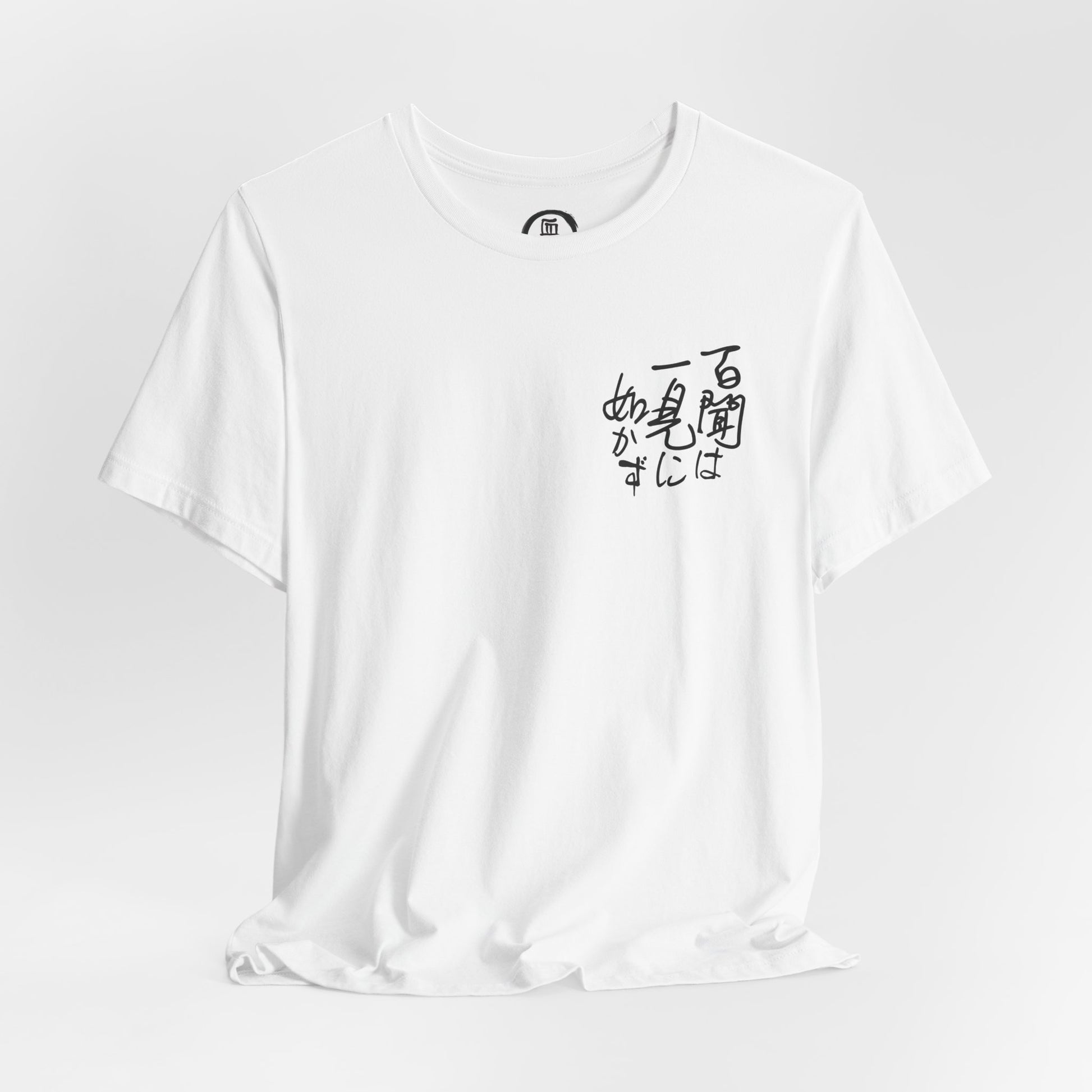 This tee carries the Japanese proverb 百聞は一見に如かず (“Seeing once beats hearing a hundred times”) as a subtle left-chest mark, paired with a bold Maru-Ichi graphic on the back. Clean from a distance, rewarding up close — built for people who move.